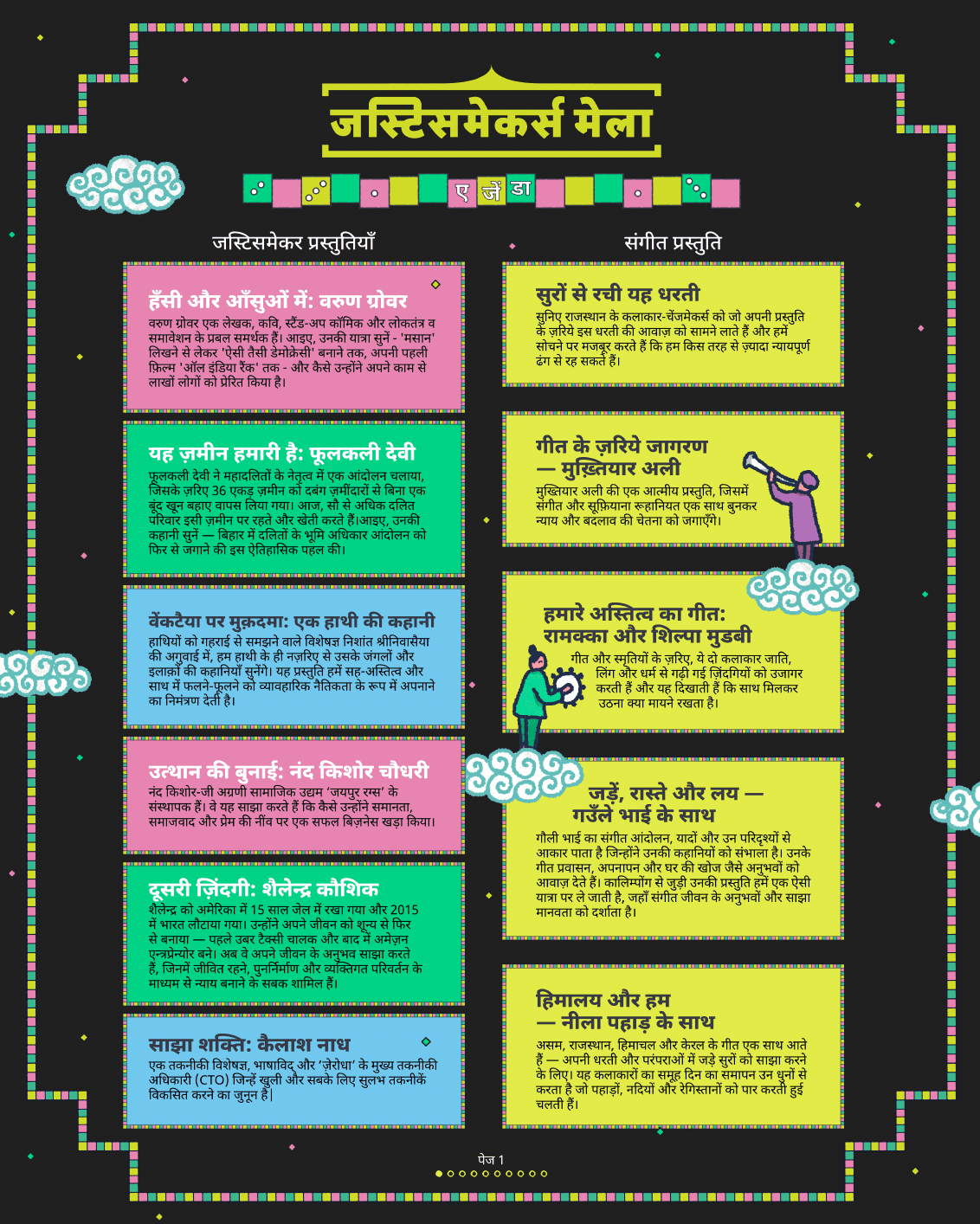 जस्टिसमेकर मेला एक सभा है, जहाँ 1K+ जस्टिसमेकर कानून और न्याय के क्षेत्र में साहसपूर्वक परिवर्तन लाने के लिए नवाचार करते हैं, नई ऊर्जा और क्षमताओं को अनलॉक करने के लिए एकत्रित होते हैं। इस वर्ष मेले का उद्देश्य मौजूदा न्याय नवाचारियों और नेताओं के समुदायों में नए न्याय परिवर्तनकर्ताओं की खोज करना और उन्हें लाना है। कहानियों, अन्वेषणों, सृजन और गहन विरामों के माध्यम से, हम कानून और न्याय में स्थायी परिवर्तन लाने के अपने प्रयासों में एक साथ बढ़ेंगे